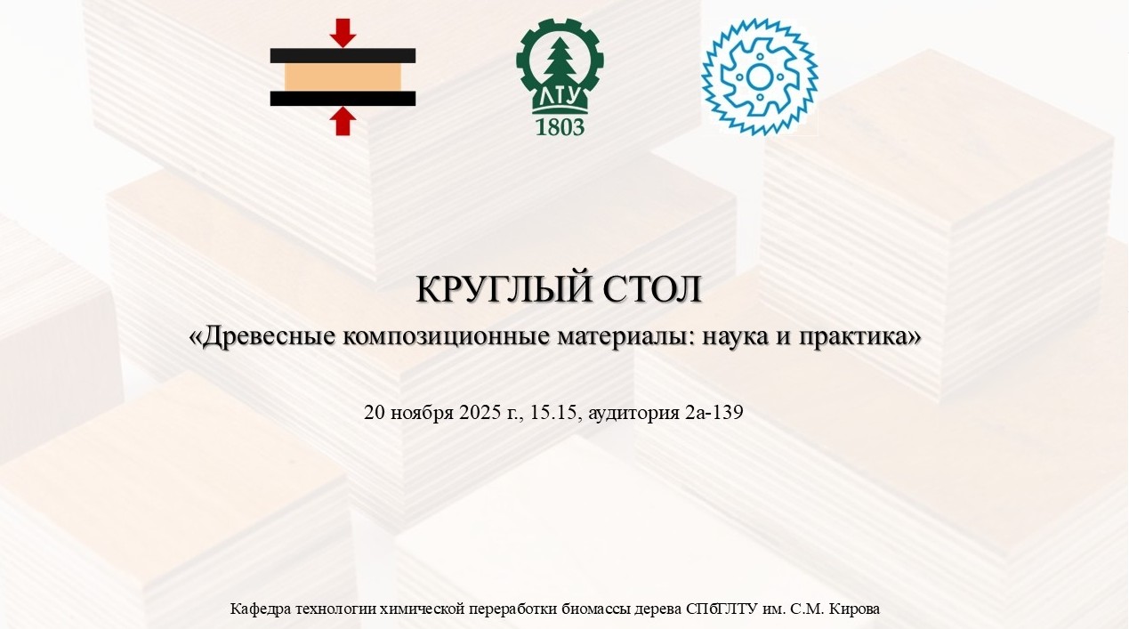 20 ноября 2025 г. на кафедре Технологии химической переработки биомассы дерева СПбГЛТУ им. С.М. Кирова состоится круглый стол на тему: «Древесные композиционные материалы: наука и практика». Мероприятие пройдёт по адресу: 194021, СПб, Институтский переулок 5 лит. Б, в аудитории 2а, ауд. 139. Время начала – 15.15.