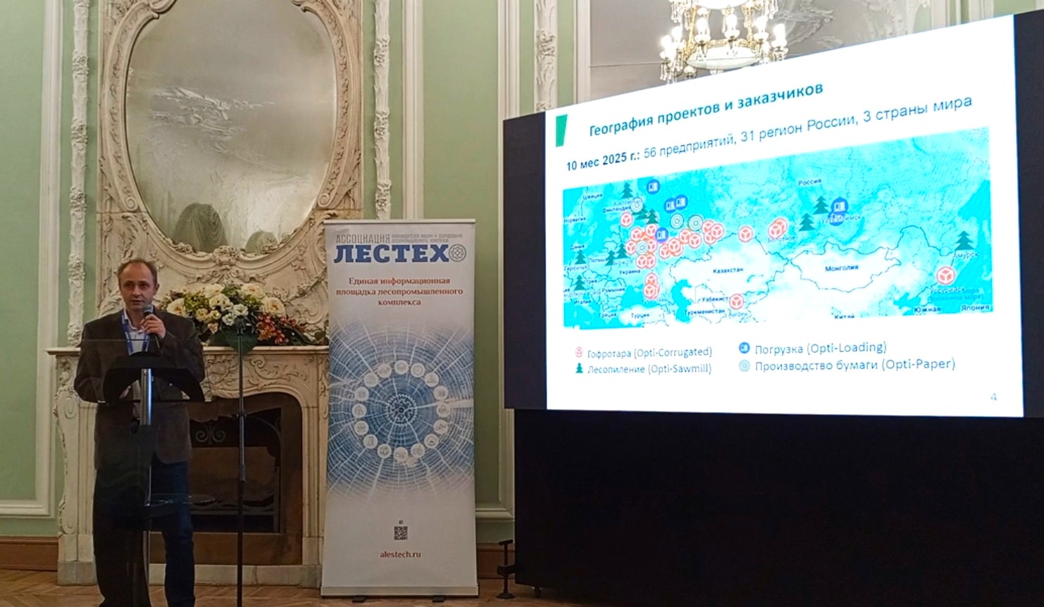 В рамках конференции «Лесопильное производство», состоявшейся в Санкт-Петербурге 18 ноября 2025 г. Антон Шабаев, директор компании «Опти-Софт», рассказал о проектах компании, реализованных к октябрю 2025 г. на 56 предприятиях, работающих не только в 31 регионе России, но и в других странах.