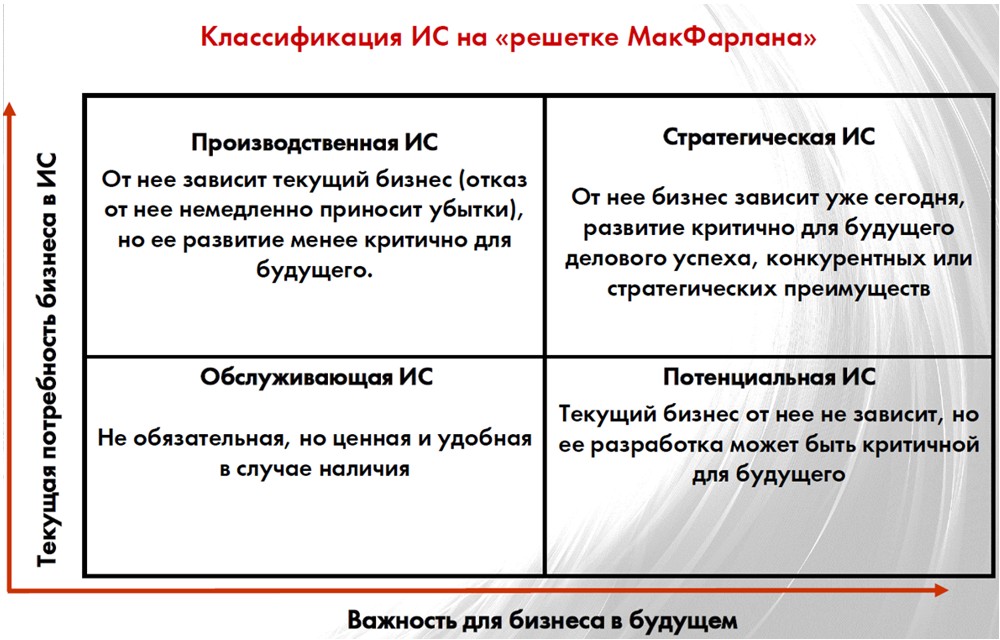 Эксперты подчеркнули роль решетки Макфарлана для оценки проектов, которая классифицирует IT-проекты по двум осям: текущая потребность бизнеса и стратегическая важность для будущего. В кризис приоритет смещается на «здесь и сейчас».